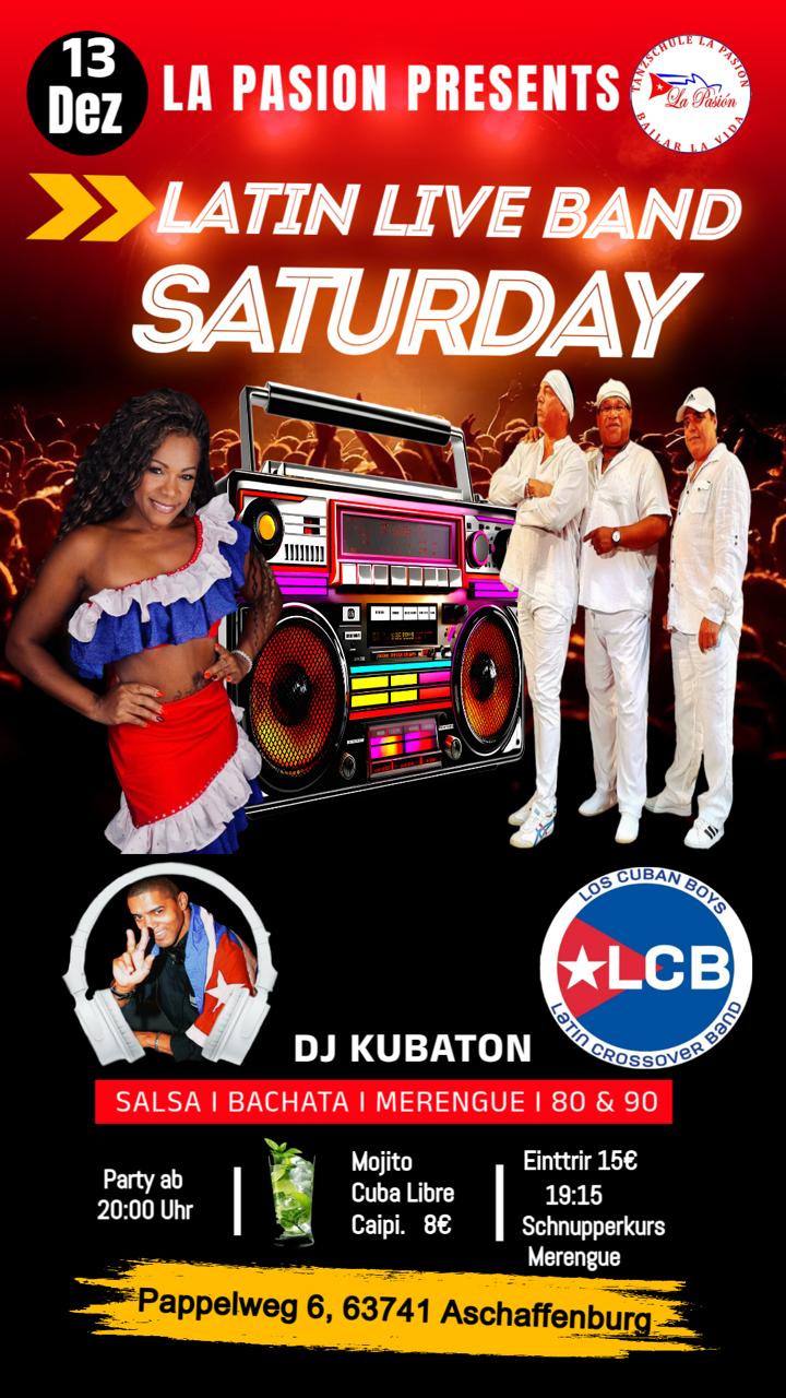 Willkommen zur Latin Live Party bei La Pasion.Um 19:15-20:00 Uhr Workshop Merengue.(dominikanische Tanz).Ab 20:00 Uhr startet die Party mit Dj Kubaton.Live Musik wird gespielt von