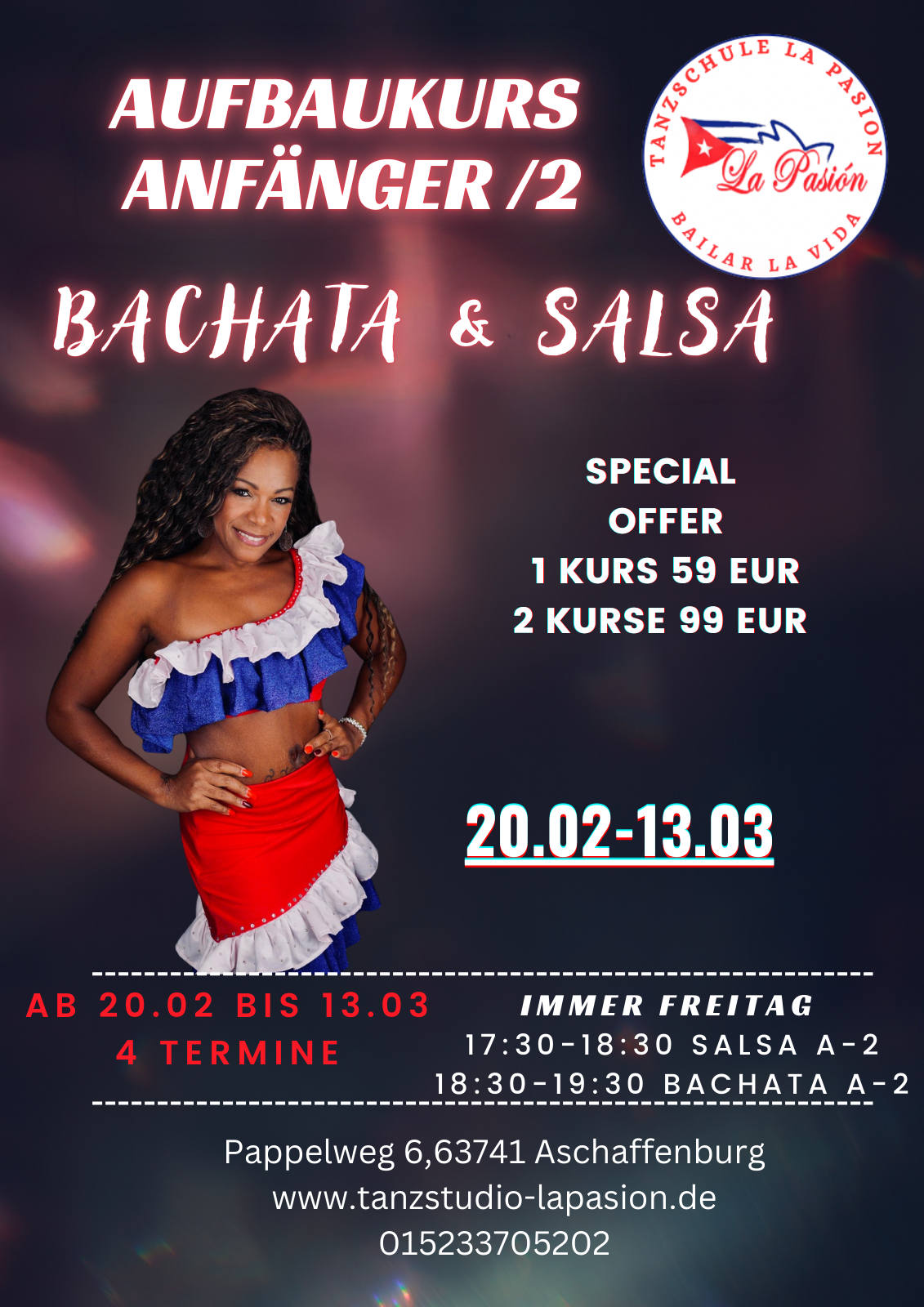 Salsa Anfänger2-Aufbau Kurs(20.02-13.03/4 Termine).Einzelkurs:59(Kombi Salsa & Bachata,99 eur.)