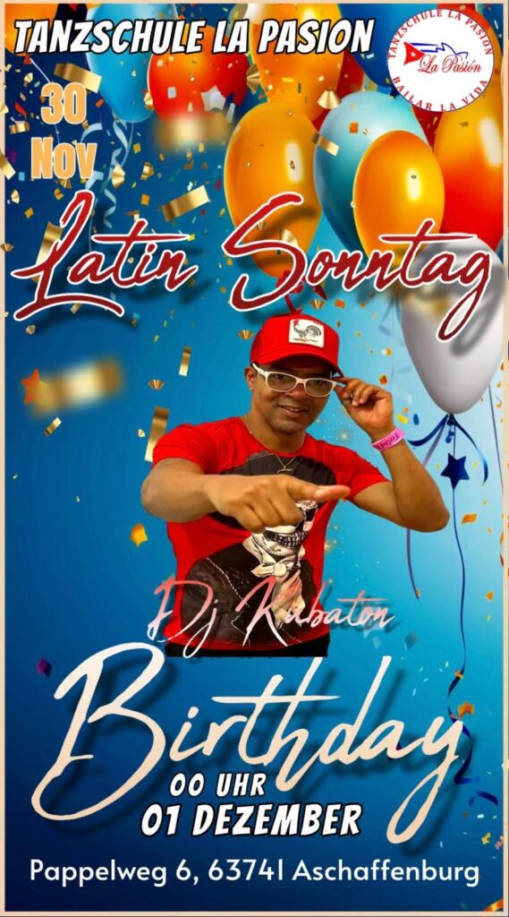 Die Tanzschule La Pasion begrüßt euch herzlich zur Latin Party am 30.11.2025 Birthday Bash von Dj Kubaton.Lass uns Feiern Die Party startet direkt ab 20:00 Uhr mit DJ Kubaton mit dem Besten aus Salsa,Bachata,Kizomba und einer Prise Latin Beats. Eintritt: 6€ Parkplätze sind direkt vor dem Gebäude. Aber Bitte achten auf der verbotenen Parkplätze, Autos […]