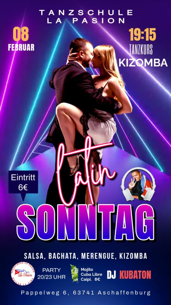 Die Tanzschule La Pasion begrüßt euch herzlich zur Latin Party am 08.02.2026 Um 19:15 starten wir mit eine Tanzskurs Kizomba. Die Party startet direkt ab 20:00 Uhr mit DJ Kubaton mit dem Besten aus Salsa,Bachata,Kizomba und einer Prise Latin Beats. Eintritt: 6€ Parkplätze sind direkt vor dem Gebäude. Aber Bitte achten auf der verbotenen Parkplätze, […]
