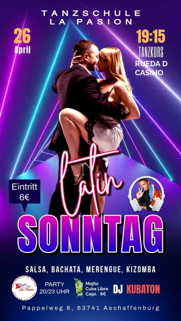 Die Tanzschule La Pasion begrüßt euch herzlich zur Latin Party am 26.04.2026 Um 19:15 starten wir mit eine Tanzkurs Rueda de Casino Die Party startet direkt ab 20:00 Uhr mit DJ Kubaton mit dem Besten aus Salsa,Bachata,Kizomba und einer Prise Latin Beats. Eintritt: 6€ Parkplätze sind direkt vor dem Gebäude. Aber Bitte achten auf der […]