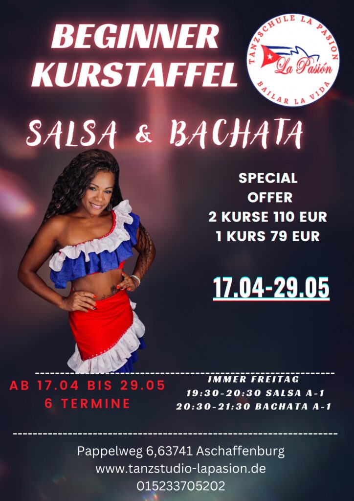 Ihr habt bereits den Grundkurs Beginner bei uns absolviert oder bereits erste Tanzerfahrungen gesammelt, dann seit ihr hier genau richtig. Die Kurse beinhalten jeweils 4 Einheiten a´60 Minuten Salsa Anfänger/2 17:30 Uhr Bachata Anfänger/2 18:30 Preis:1 kurs 59 eur 2 kurse 99 eur